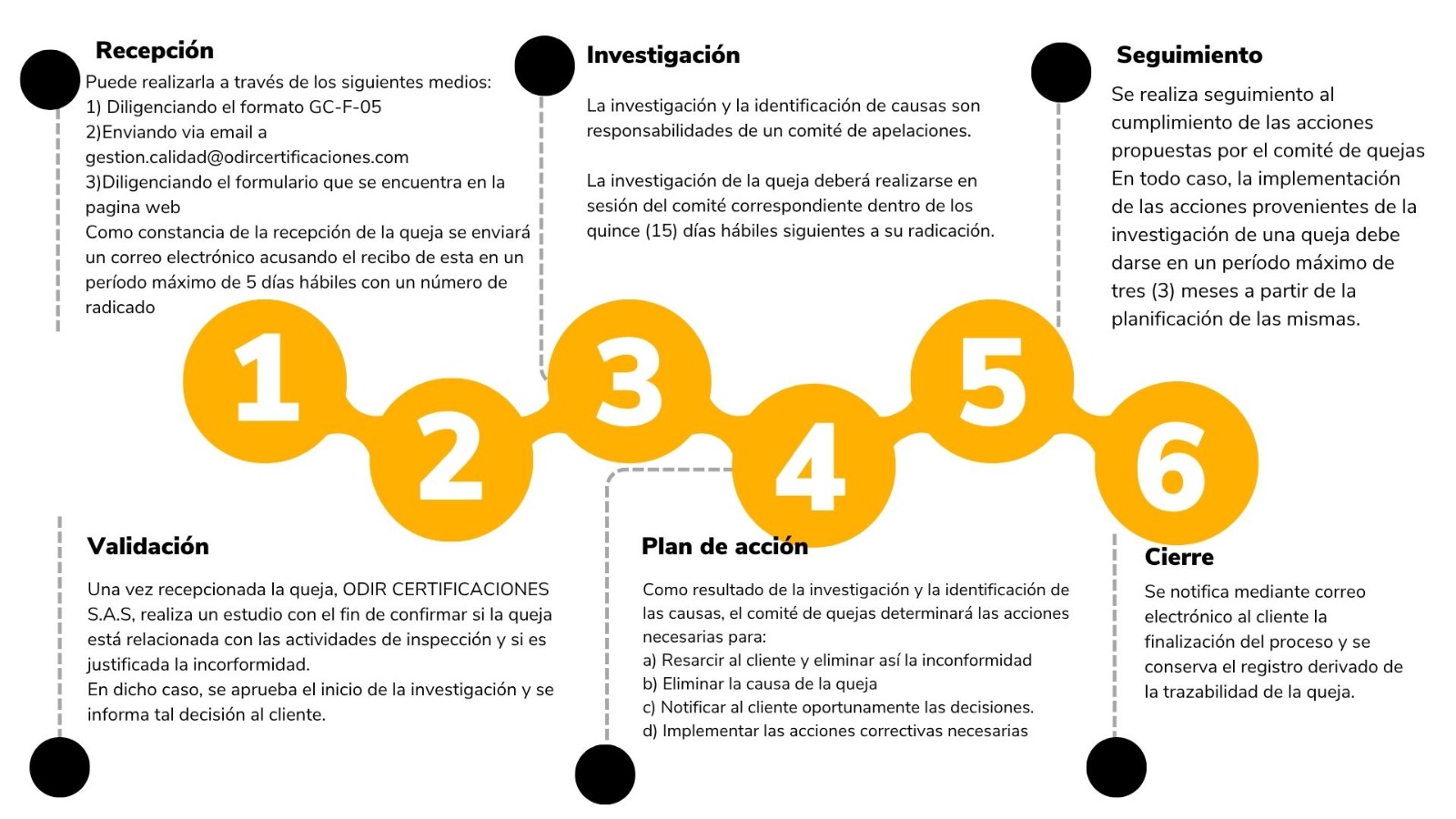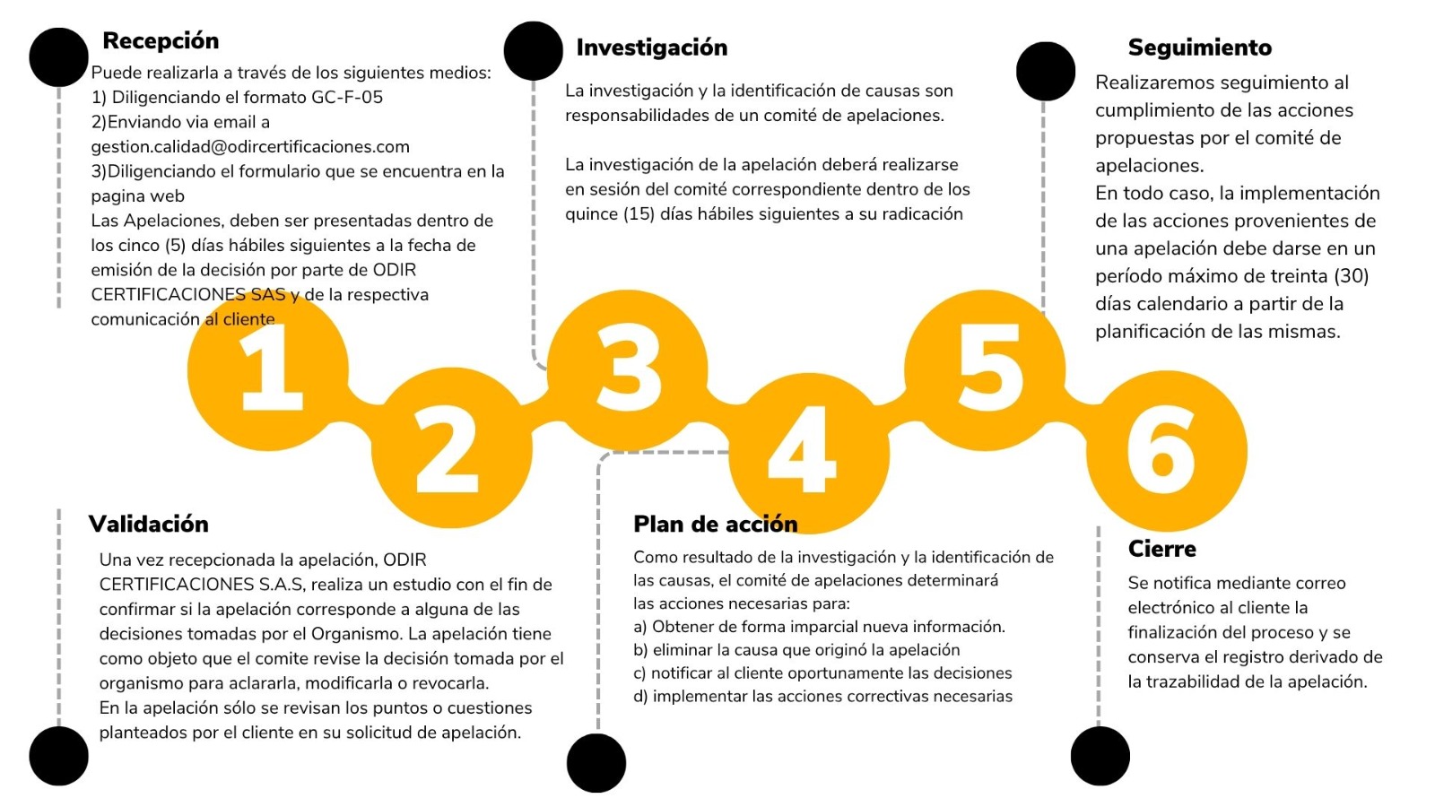 Apelación: Solicitud del proveedor del ítem de inspección al organismo de Inspección de reconsiderar la decisión que tomó en relación con dicho ítem. Deben ser presentadas ante el organismo, dentro de los cinco (5) días hábiles siguientes a la fecha de emisión de la decisión por parte de ODIR CERTIFICACIONES SAS y de la respectiva comunicación al cliente.